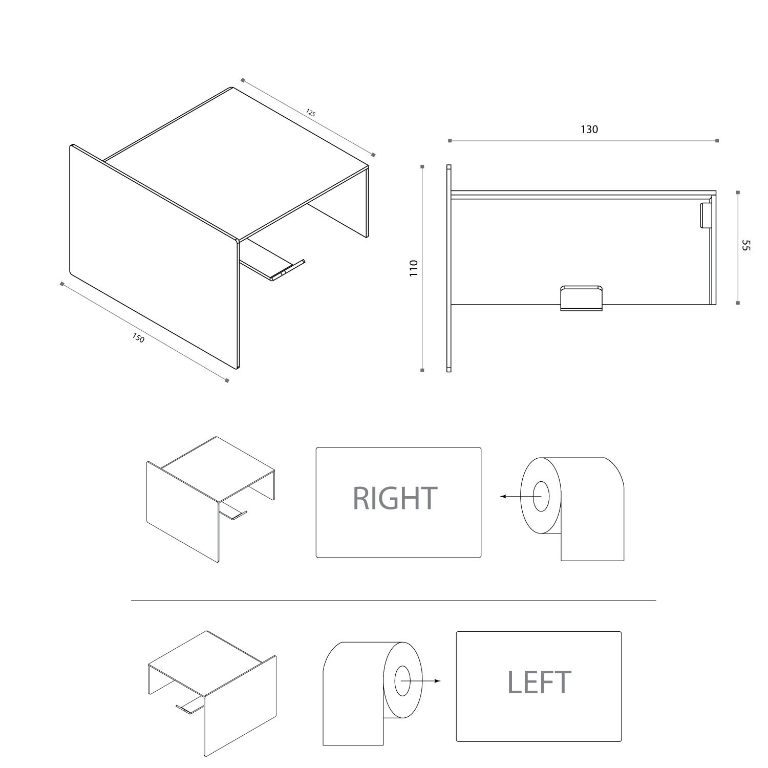 This minimalist design toilet paper holder also offers a small surface on top for placing a decoration, scent, or essentials while your hands are busy. Available in left or right variants.